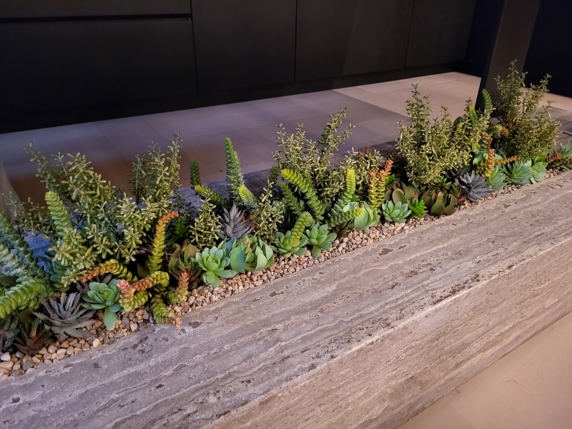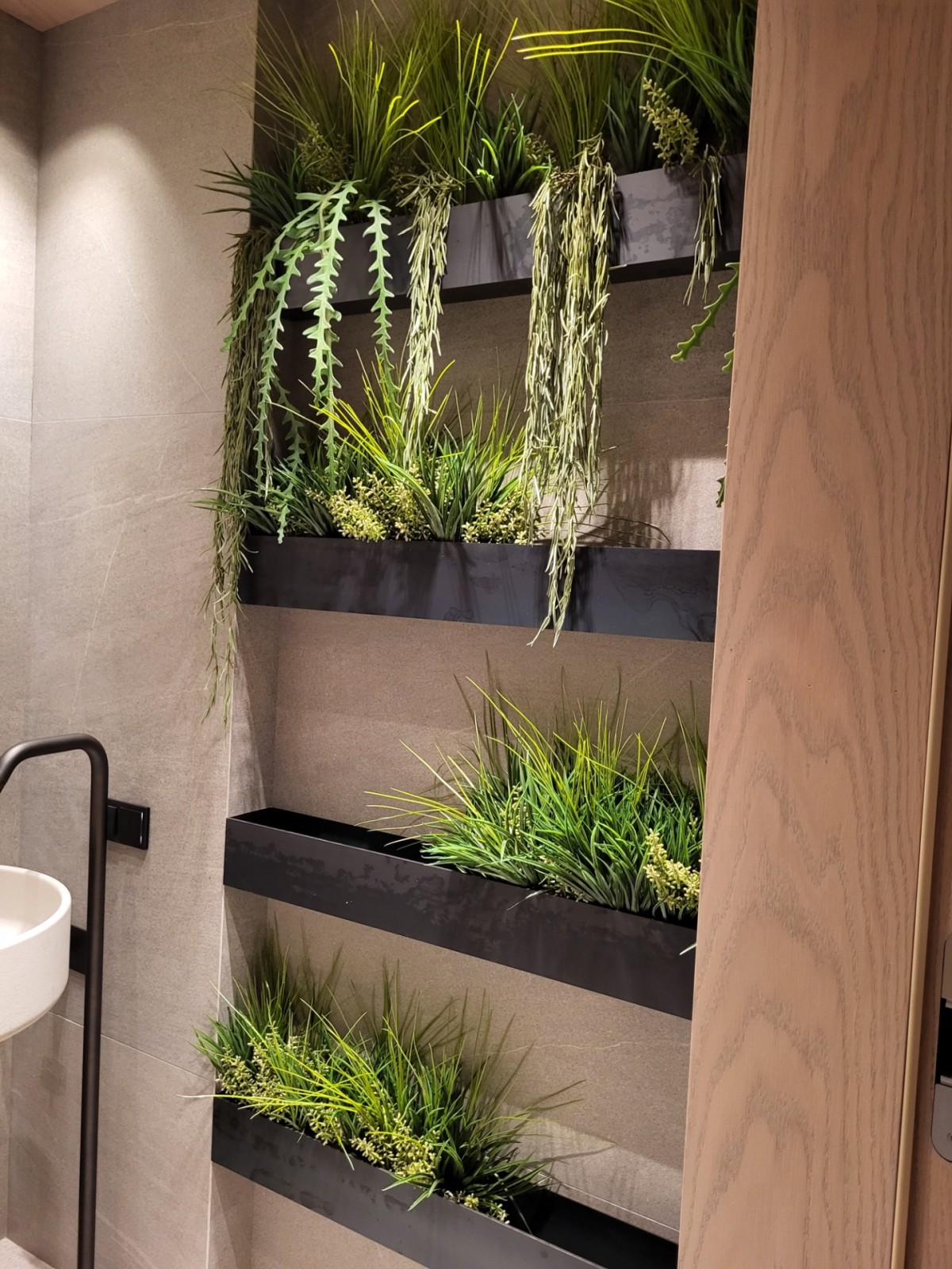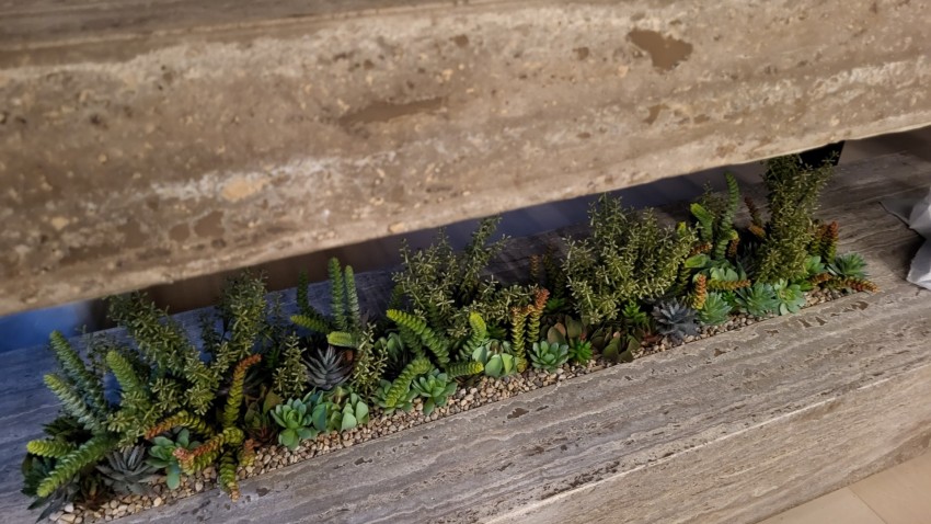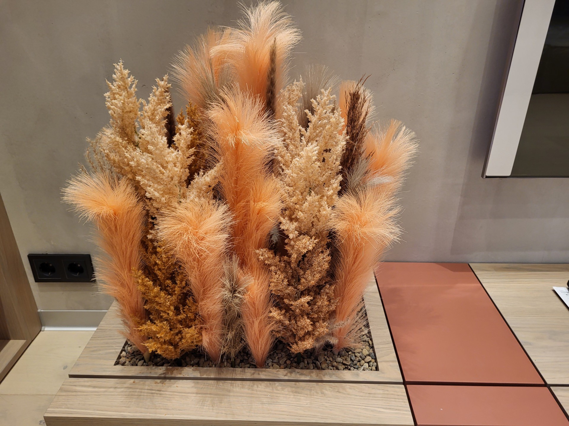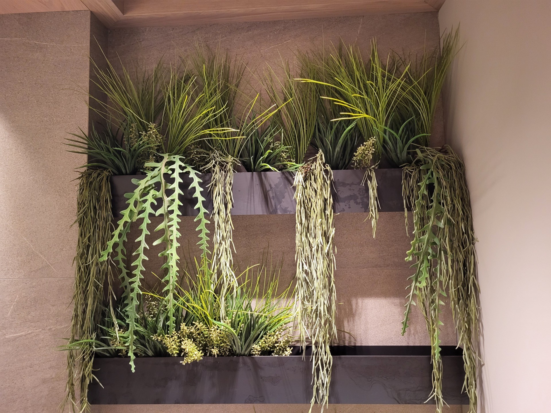 Tika apzaļumotas trīs telpas - virtuve, istaba un sanmezgls. Virtuvē, zem galda saliņā izveidota mākslīgo sukulentu kompozīcija, istabā persiku tonī smilgu kompozīcija un sanmezglā dažādu nokareno mākslīgo zaļumu siena.
