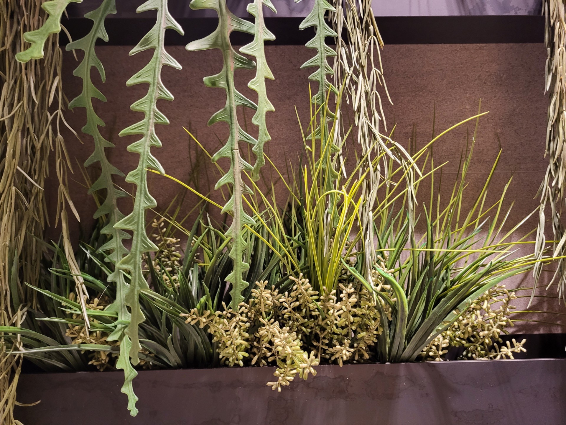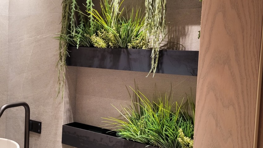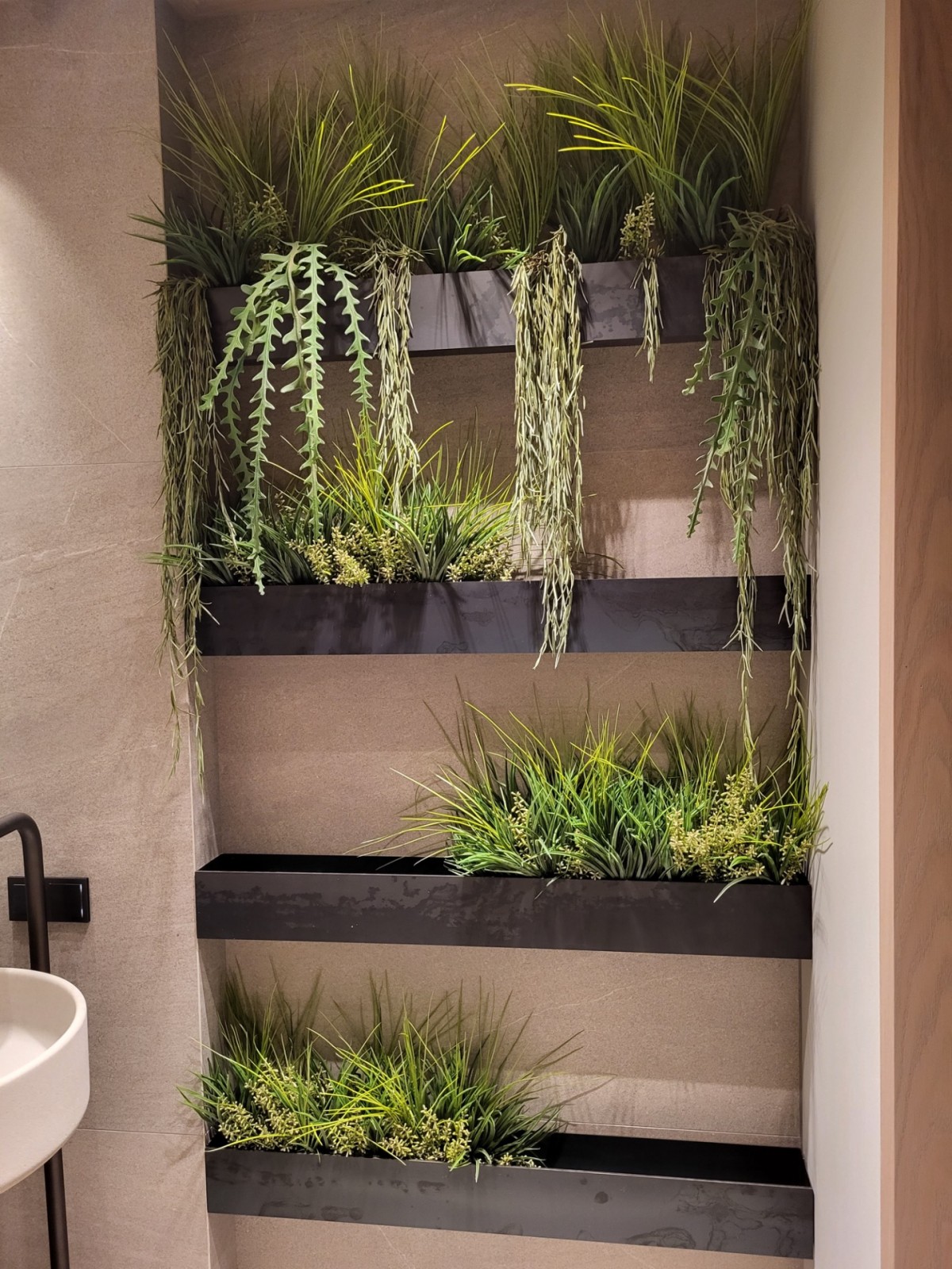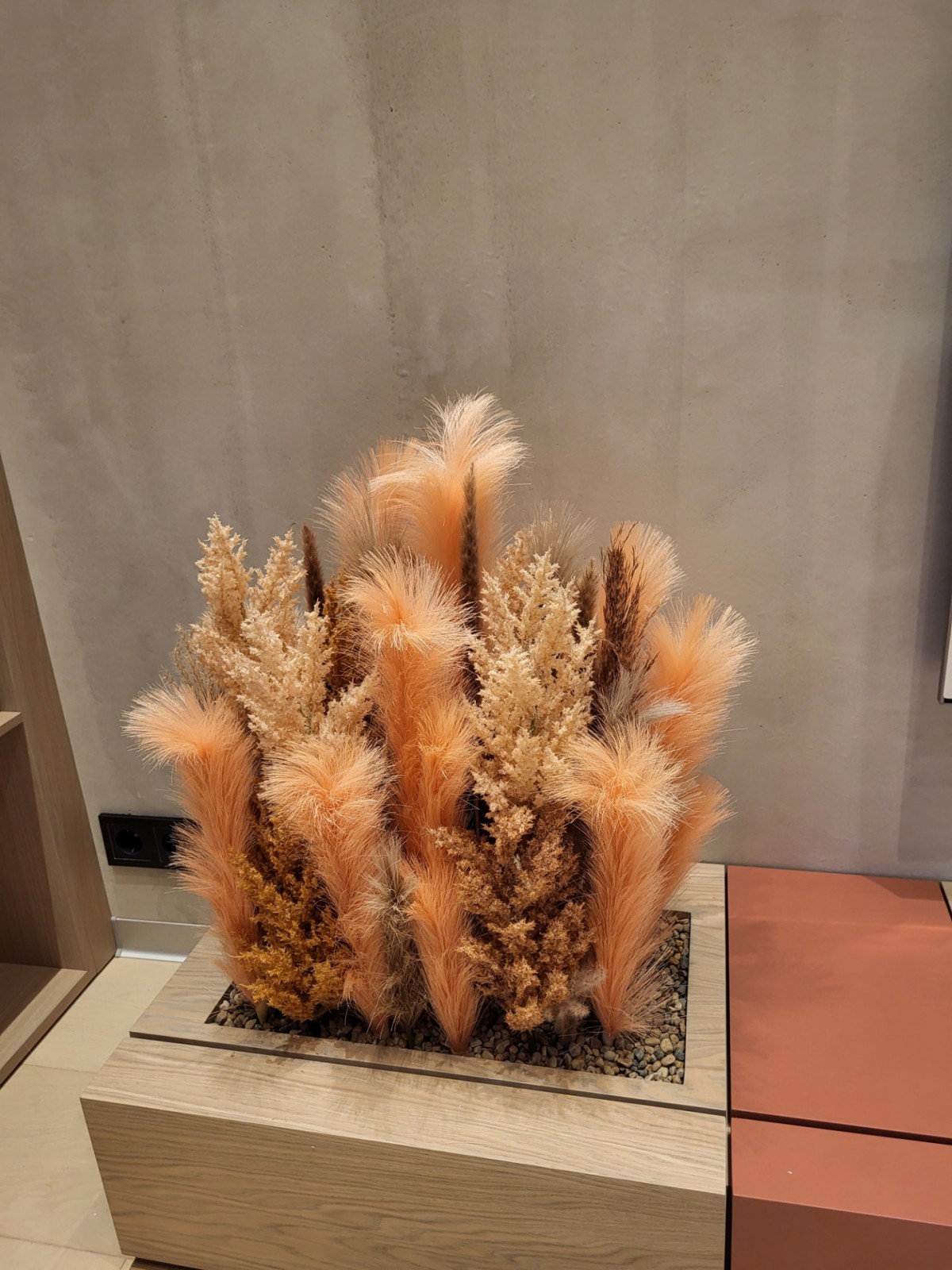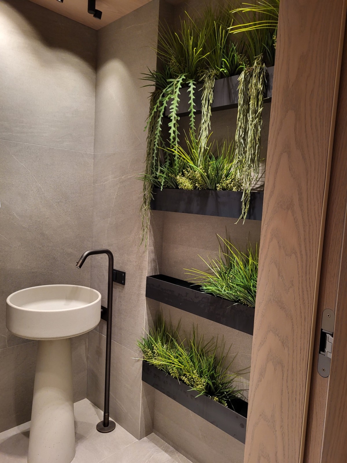 Tika apzaļumotas trīs telpas - virtuve, istaba un sanmezgls. Virtuvē, zem galda saliņā izveidota mākslīgo sukulentu kompozīcija, istabā persiku tonī smilgu kompozīcija un sanmezglā dažādu nokareno mākslīgo zaļumu siena.