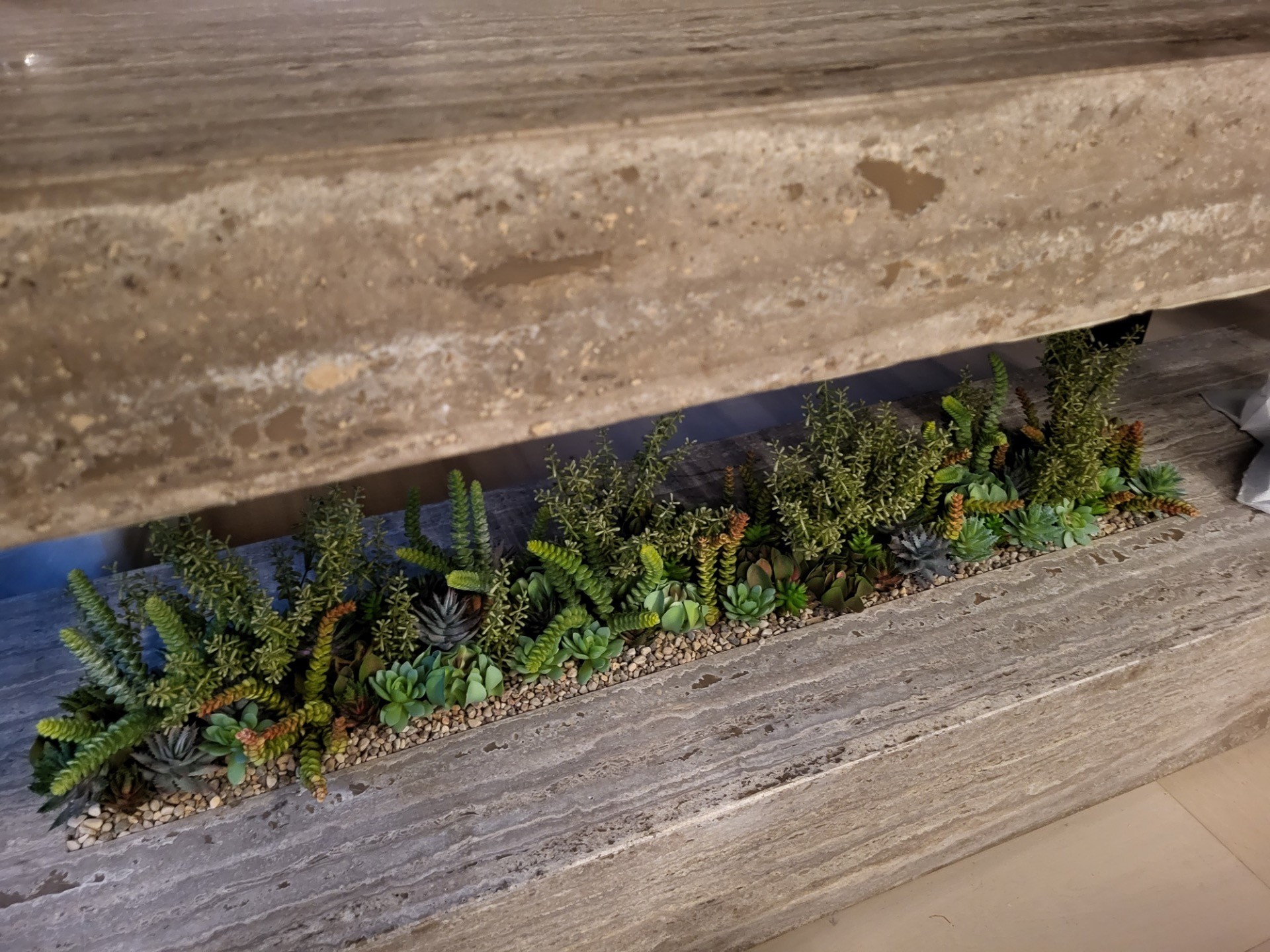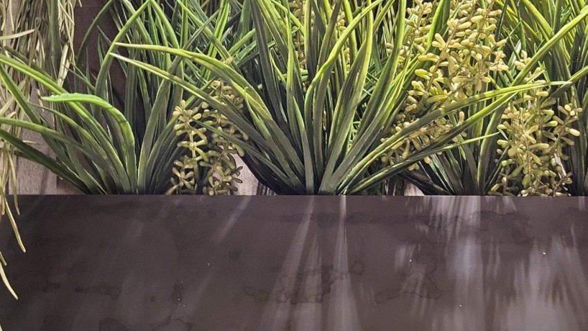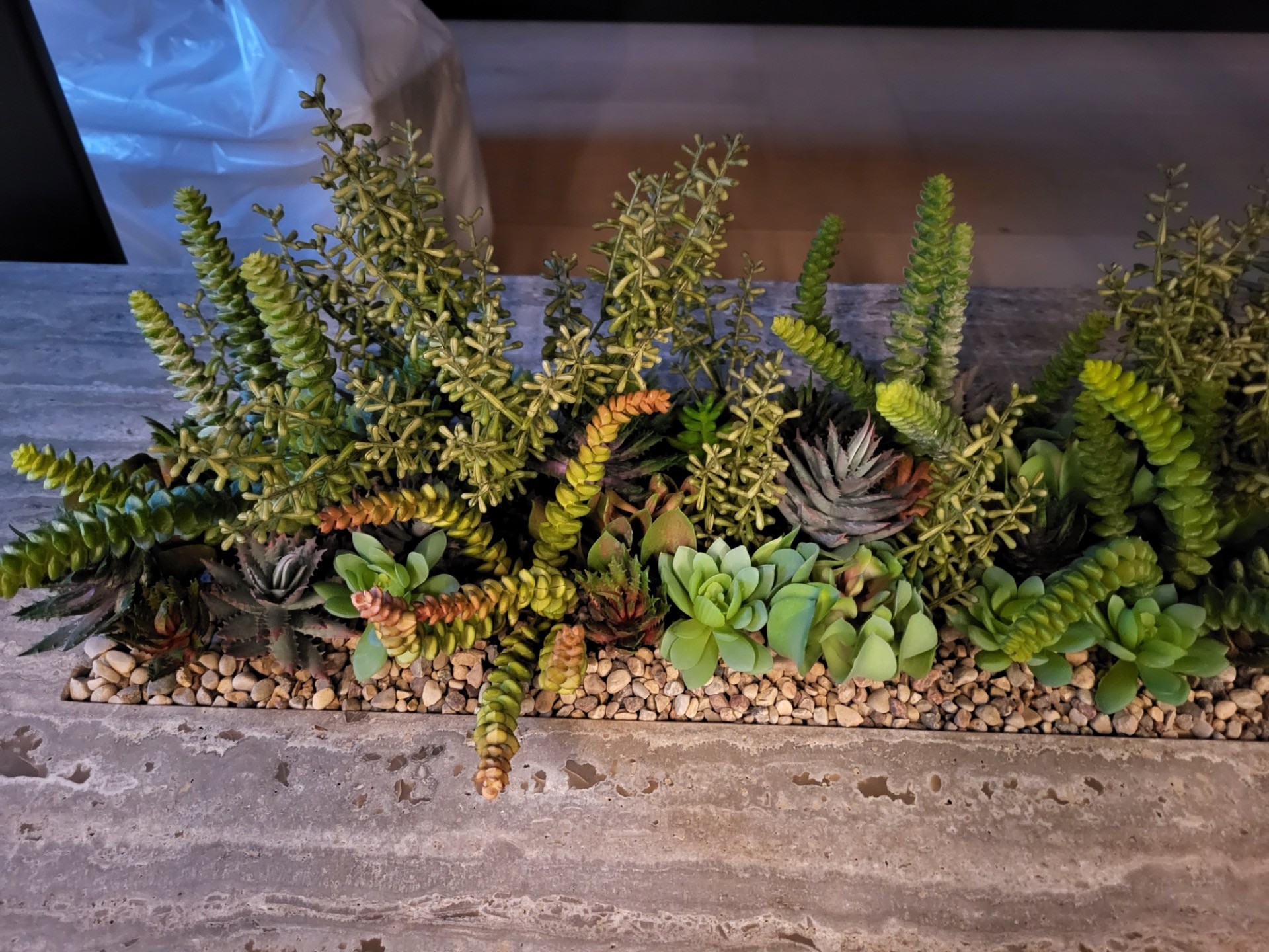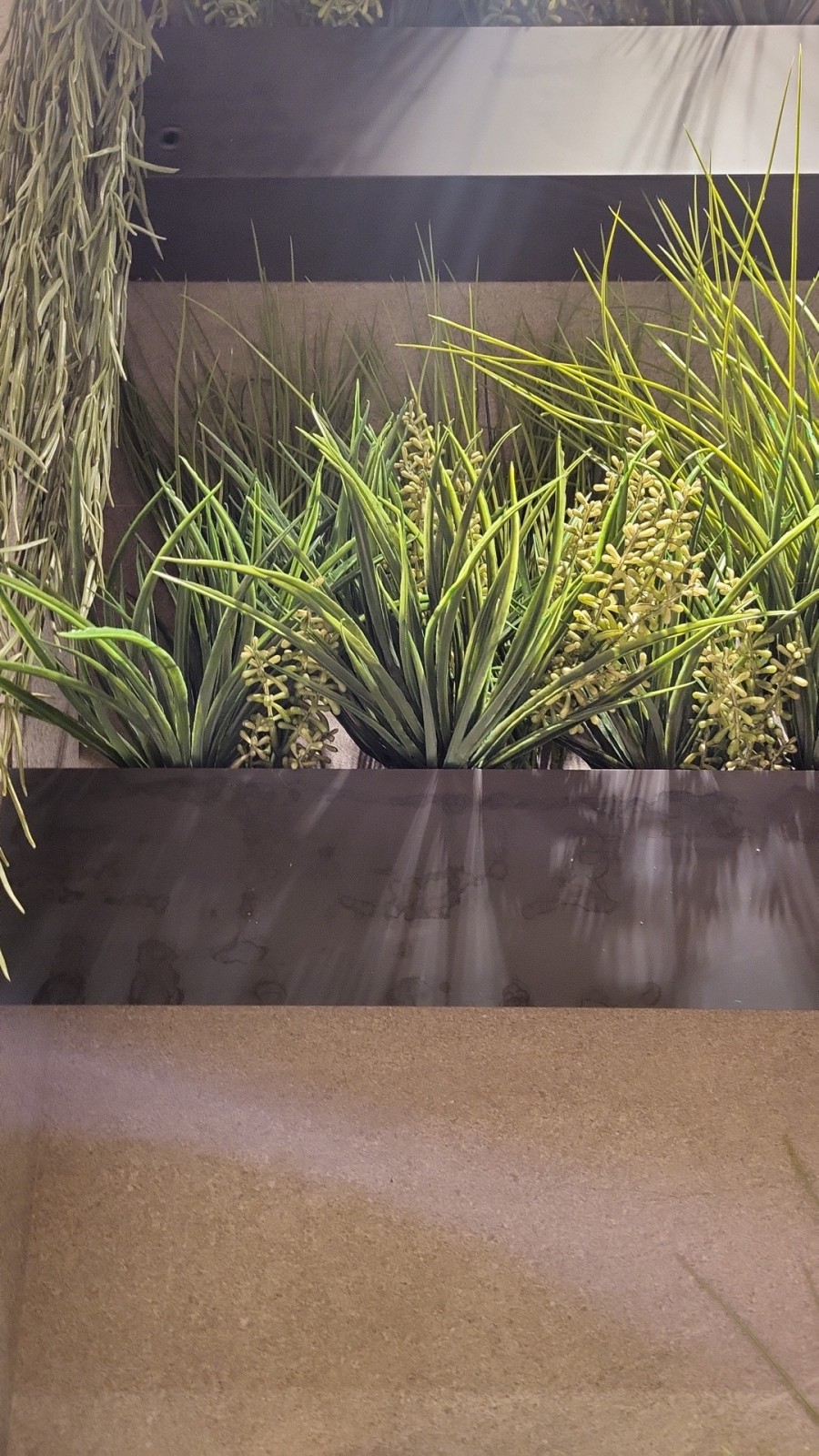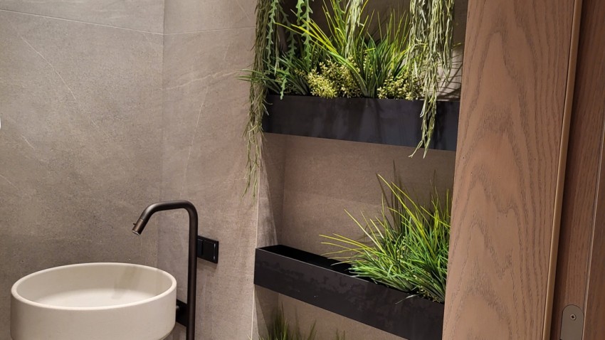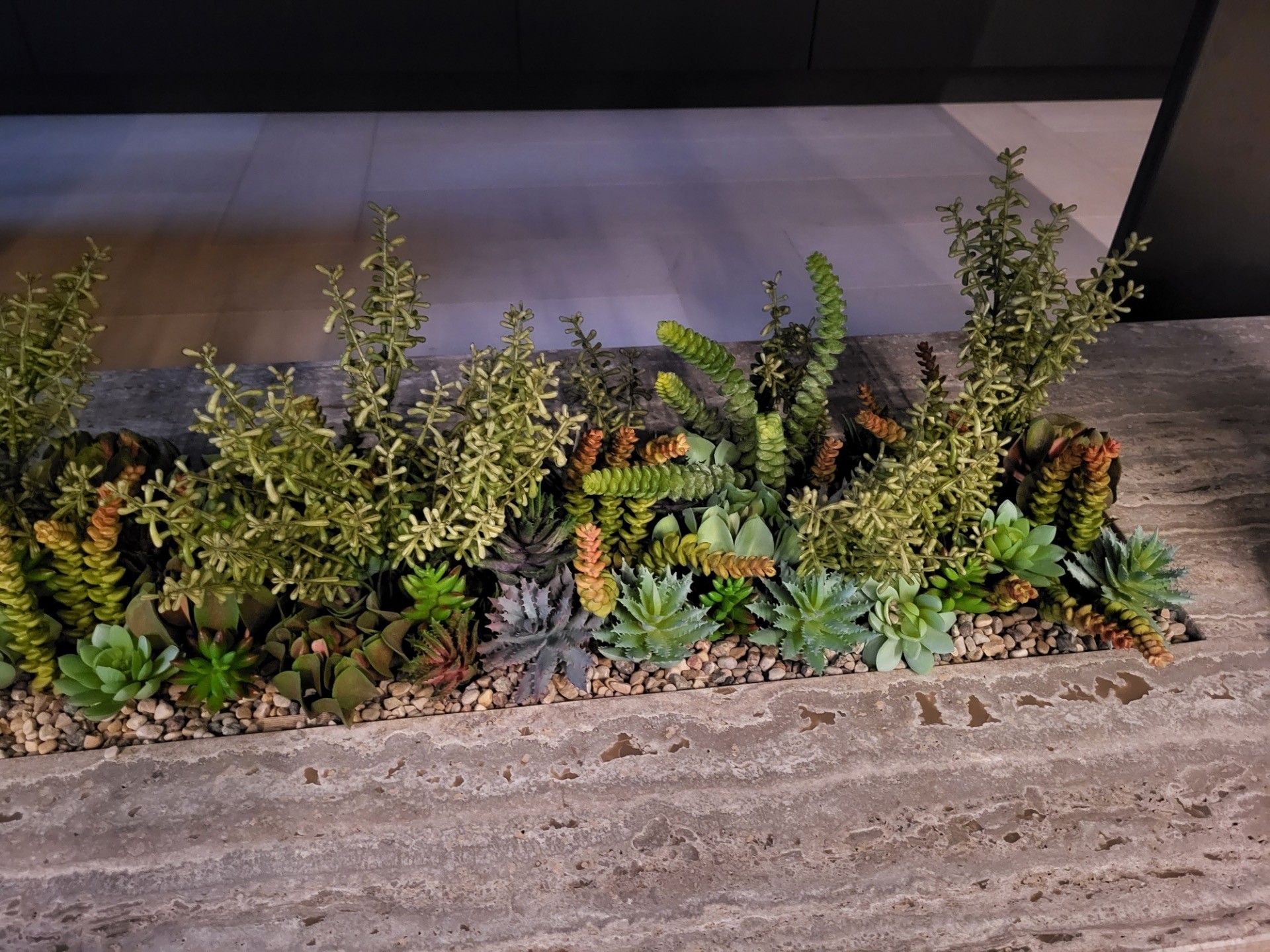 Tika apzaļumotas trīs telpas - virtuve, istaba un sanmezgls. Virtuvē, zem galda saliņā izveidota mākslīgo sukulentu kompozīcija, istabā persiku tonī smilgu kompozīcija un sanmezglā dažādu nokareno mākslīgo zaļumu siena.