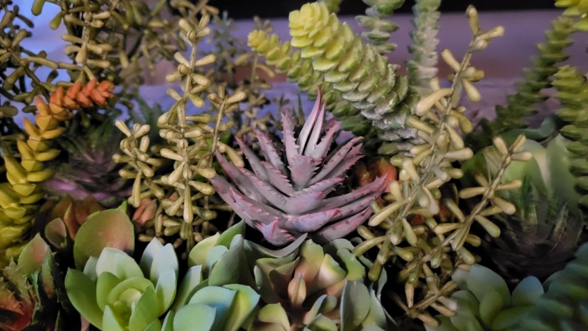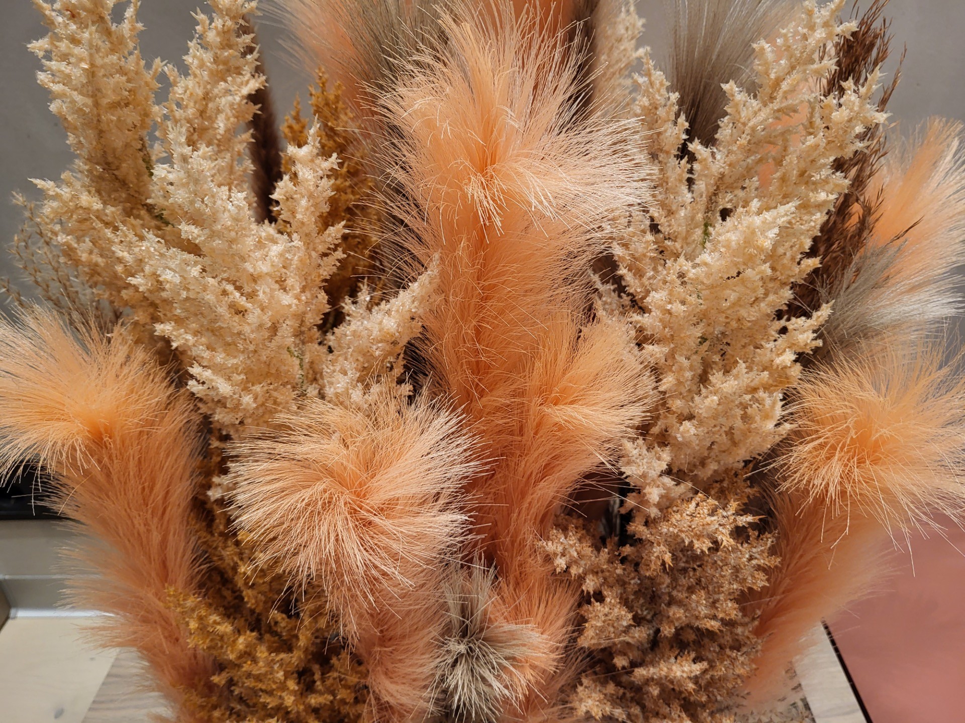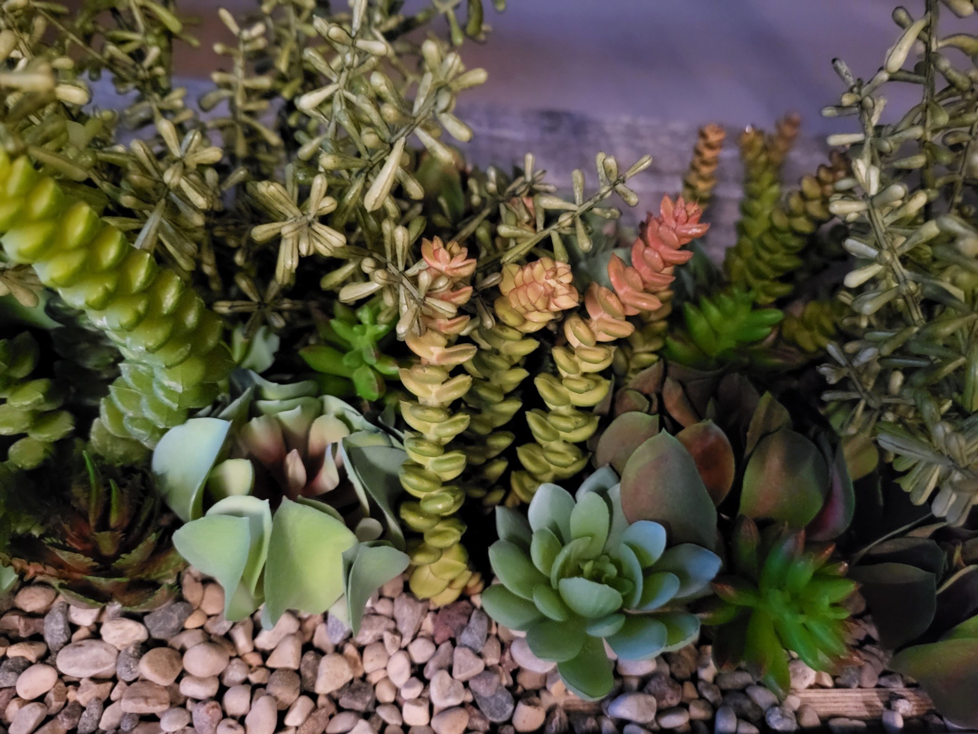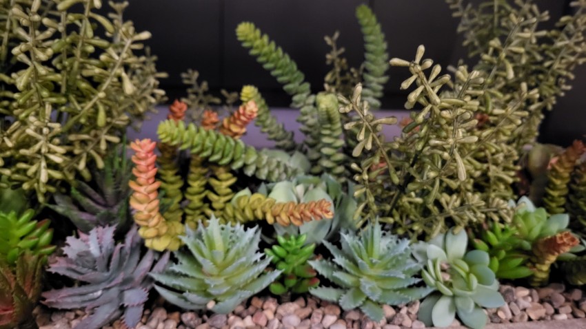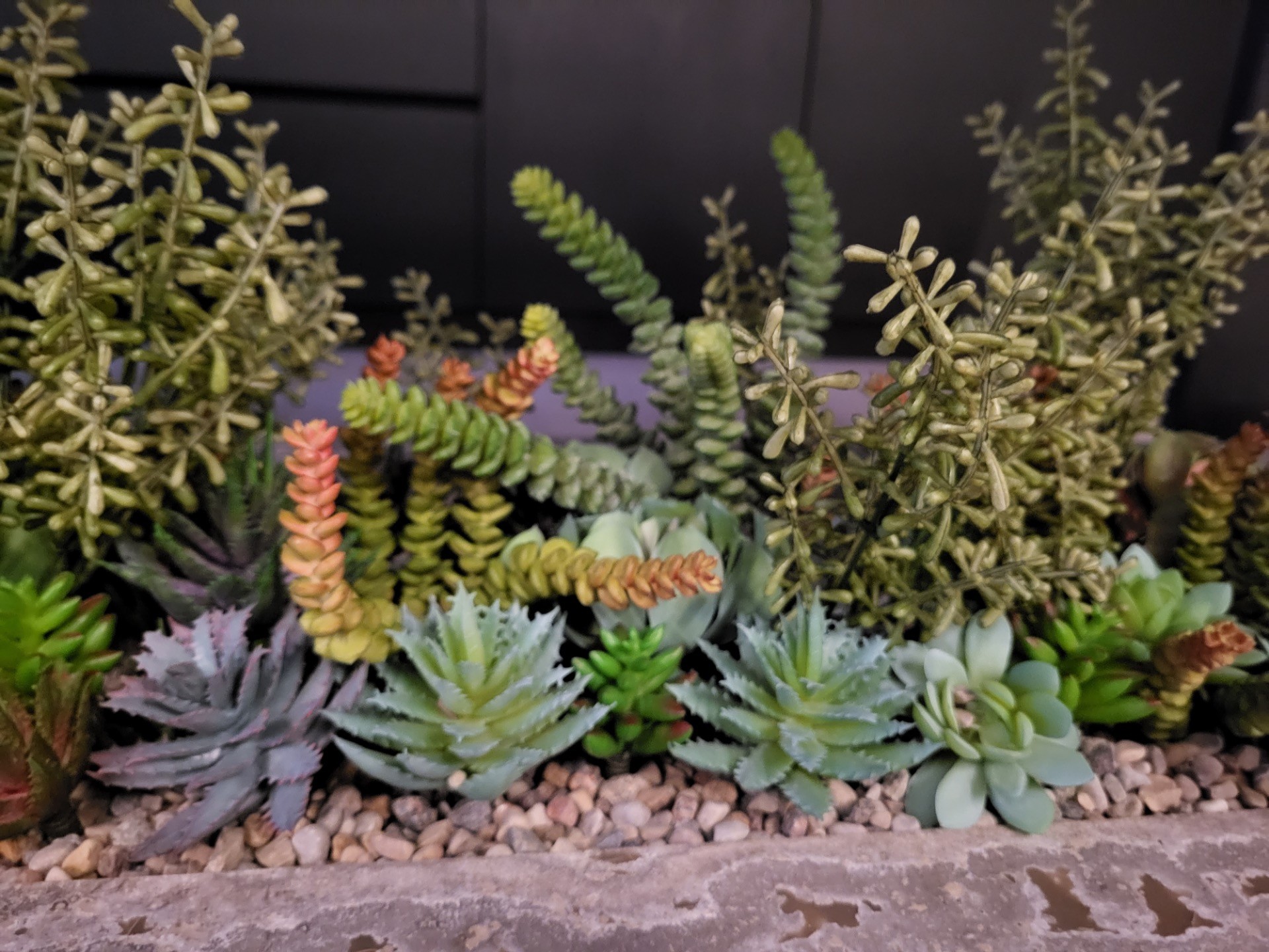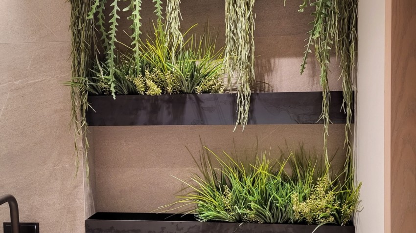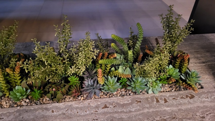 Tika apzaļumotas trīs telpas - virtuve, istaba un sanmezgls. Virtuvē, zem galda saliņā izveidota mākslīgo sukulentu kompozīcija, istabā persiku tonī smilgu kompozīcija un sanmezglā dažādu nokareno mākslīgo zaļumu siena.